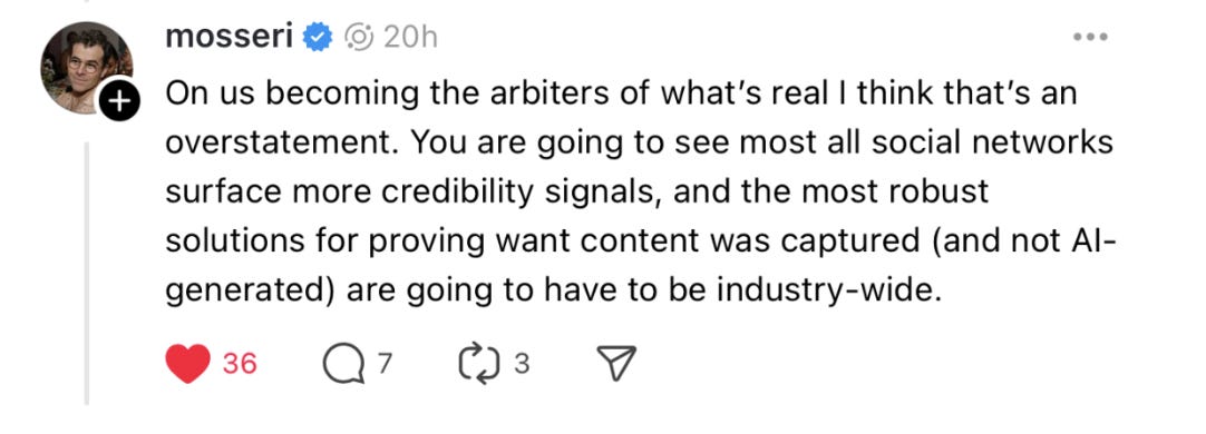 By saying “most all social networks,” he frames an industry-wide argument rather than one specific to Instagram. Platforms may not like the optics of being seen as Temples of Truth, but they are already laying the groundwork for thatfuture.