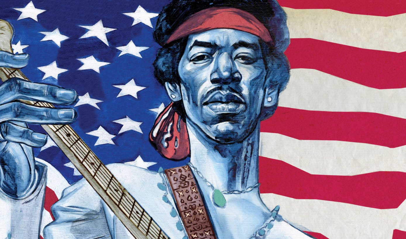 In the new millennium, we’ve come to see Hendrix as a braid-weaving common denominator: Western, African, Native American, urban and cosmic, outlaw and citizen, radical and patriot, combative and peace loving. He was also bluesy, metallic, pop, avant-garde. His music took startling risks that paid off. His verve and swagger onstage and in the studio amounted to a flagrant diss of not just the warmongers but also the music industry’s corporate mentality in its quest for blue-chip profitability. Hendrix paid for his attitude big-time, with humiliating royalty percentages and circumscribed airplay on Black and white radio stations—all this before his chronic insomnia led to his accidental overdose on alcohol and his latest girlfriend’s Vesparax pills at age 27. All he’d wanted was a decent night’s sleep.
