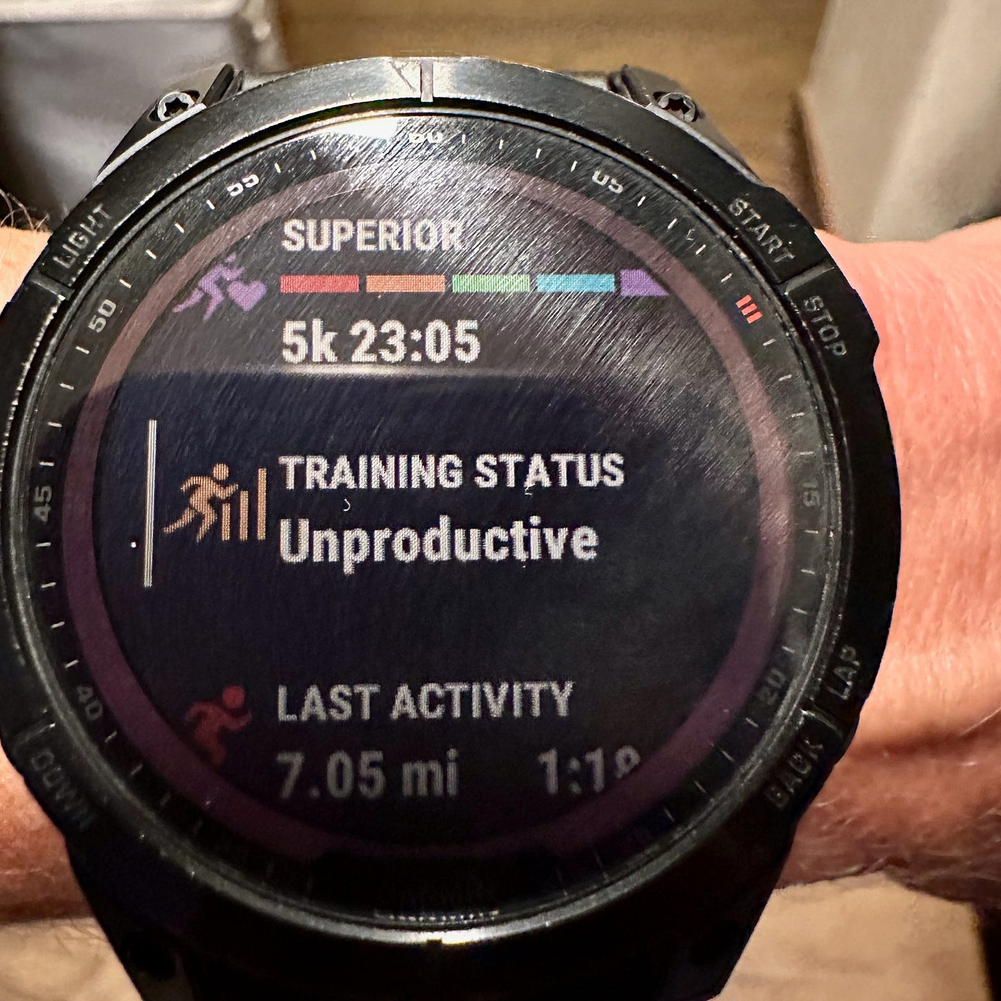 Every time I looked at my watch, it reported that my training status was “Unproductive,” even though I ran five or six times during the week with a couple of runs stretching past 2.5 hours. Even though I did one interval workout that got my heart rate and effort high enough to make saying a full sentence out loud a struggle, and one run where I paused my watch midway to do plyometric exercises like jump squats and skipping. Even though I did a few strength training and yoga sessions, and groomed and rode my horses.