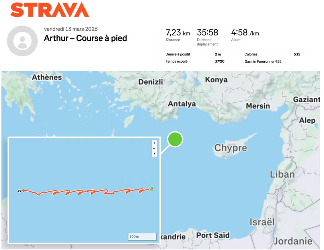Arthur had a profile on the Strava fitness app that anyone could view, because it was set to "public." As a result, the young officer almost instantly revealed the exact location of the French aircraft carrier Charles de Gaulle in the Mediterranean Sea as it traveled northwest of Cyprus, together with its escort, about 100 kilometers off the coast of Turkey, Le Monde found.