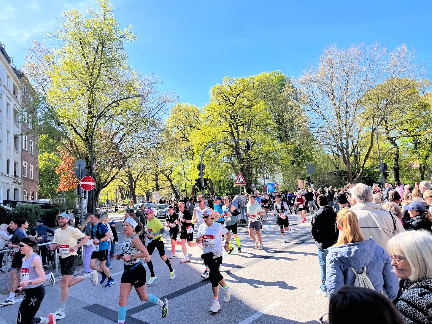 This Saturday the 40th anniversary of the Hamburg Marathon was celebrated with a course record. Of course I missed Othmane El-Goumri flying by near our house, on his way to finishing in 2:04:24, but I got to cheer on plenty of slower runners right at the 22km mark.
