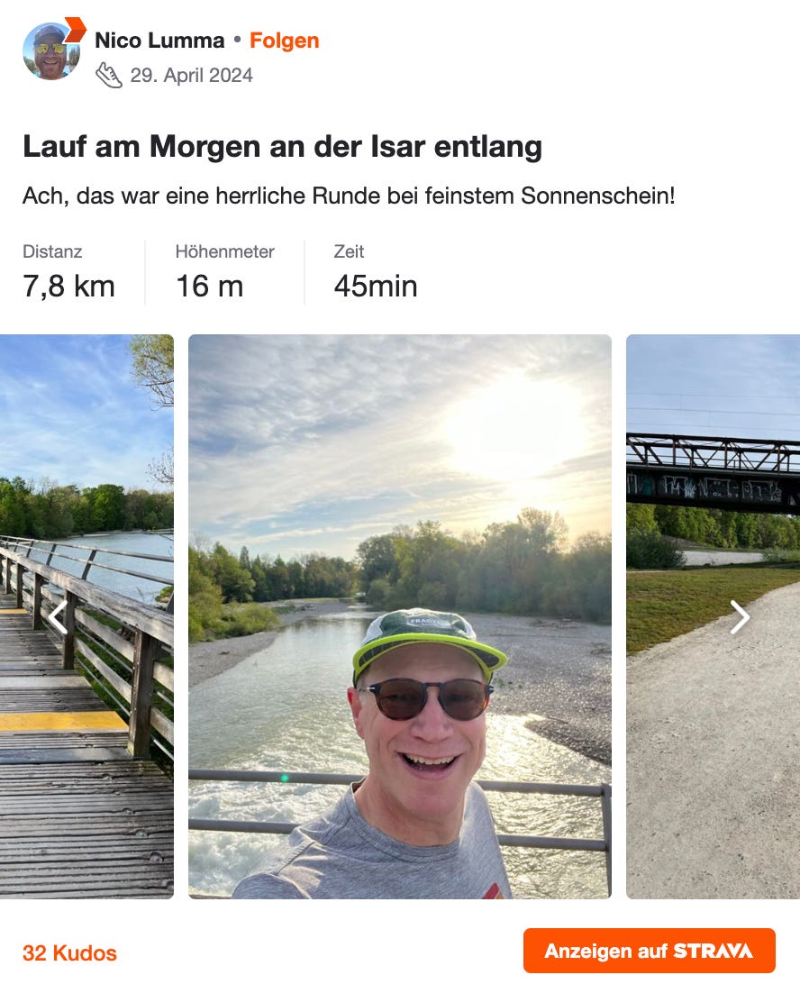 Last week I finally managed to run more than 50 km and it started out with two nice runs in the sun in Munich. I’m really fond of this city with great running routes along the River Isar. Highly recommended!